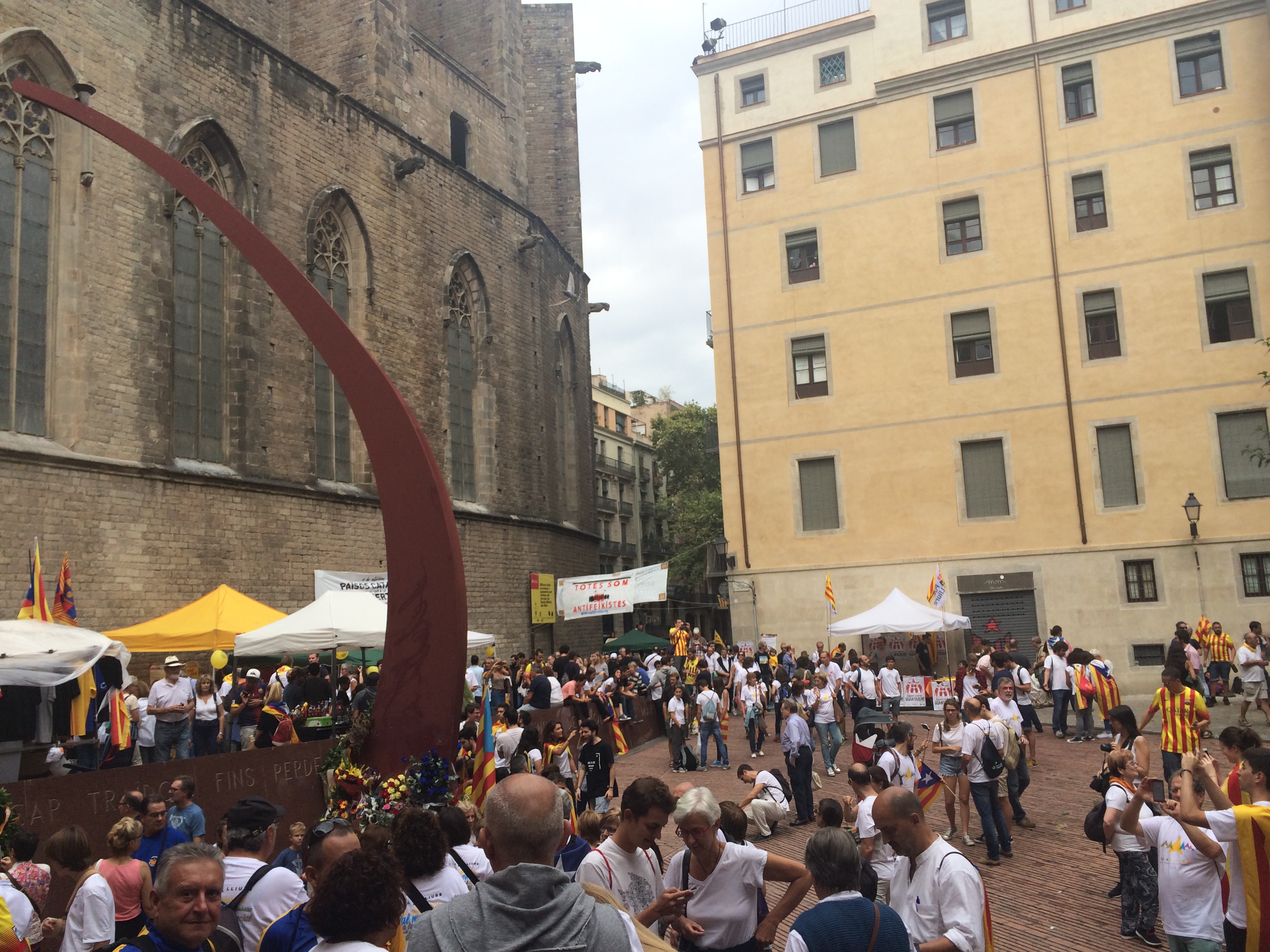 It was really energizing to see such a crowd! My first reaction was : maybe this place is even more lively than Paris! We moved to our hostel, which was about a half an hour walk, checked in, utilized the free Wi-Fi to search for the Sandeman’s Free Tour in Barcelona! (Ha Ha, yes, again! ) The time right now was 1:00 PM, and the tour started at 2. Good timing, man! The others wanted to rest in the room for a while, so I was off again, solo, map in hand, to the start point of the tour! Reaching at 1:55 PM, without a prior booking, I saw about 90 people in line for the tour. Reservations only. What? Seriously? I literally ran all the way here so I could be on time. I talked again to see if they would let me join in, but unfortunately not. Still not welcoming the idea, I followed one of the guides to the first spot on the tour, about a minute from where we started, keeping my distance, but I could feel that this wasn’t the experience I was looking for. So I went back to the start point and talked to the representative standing there. He was nice enough to tell me what was going on : It was 11th September ( Now I know two 9/11 s ) which is the National Day of Catalonia. The day they lost in the Spanish Siege of Barcelona, 1886. Right now, they are protesting for their independence from Spain. It felt really exciting to hear this, and the representative, Tommy pointed me to the general direction of the crowd, where all the action was. That’s where you’d find the most number of people, that is where it’s all going on.